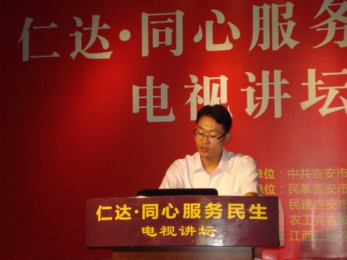 8月8日,由中共市委统战部主办、各民主党派市委会承办,江西仁达企业发展有限公司协办的“同心·服务民生”电视讲坛活动在仁达艺术馆举办。民进井冈山大学总支会员、井冈山大学建筑学院杜晟连老师代表民进市委会做了《新农村建设中的村庄规划与建筑》的讲座。吉安广播电视台对讲座进行了实况录制。电视讲坛的实况录像已于10月6日在吉安电视台一套节目播放。