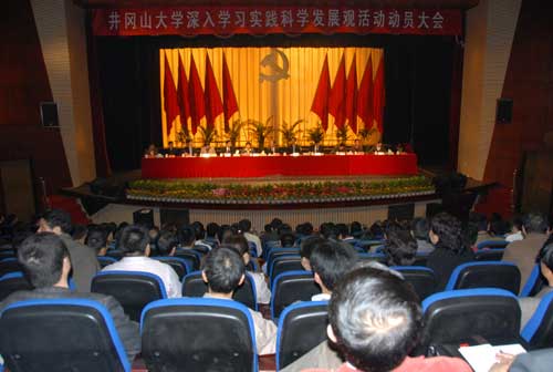 3月22日晚,我校深入学习实践科学发展观活动动员大会隆重举行,省委深入学习实践科学发展观活动领导小组指导检查组第五组组长张桂生,指导检查组成员梁文懋、张小谦、秦智虹到会指导。在校的领导万继抗、金桂英、桂国庆、郭名根、罗学渭、曾建平,党委委员、办公室主任吕玉华,党委委员、组织部长龙学先,党委委员、宣传部长肖长春出席了会议。全校副处级以上党员领导干部、党员教师、党员干部、党员职工、党员学生代表,以及民主党派和无党派人士代表、离退休人员代表等近500人参加了会议。省委指导检查组组长张桂生讲话,校党委书记万继抗就我校开展深入学习实践科学发展观活动作动员报告,校党委副书记金桂英主持。
