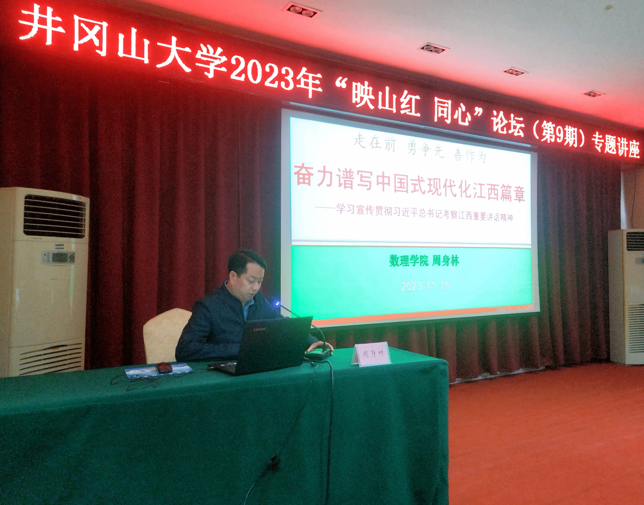 数理学院副院长、吉安市侨联副主席、学校留联会副会长、九三学社井大副主委周身林博士以《走在前,勇争先,善作为,奋力谱写中国式现代化江西篇章》为题,系统阐述和深入解读了习近平总书记在江西考察时重要讲话的深刻内涵、重大意义以及如何以实际行动回报总书记关心厚爱。讲座立意高远、主题鲜明、内容丰富、贴近实际,引领我们以"走在前、勇争先、善作为"的标准和要求强化工作实践,不断增强学习宣传贯彻习近平总书记考察江西重要讲话精神的政治自觉、思想自觉和行动自觉,为奋力谱写中国式现代化江西篇章贡献井大党外人士力量。