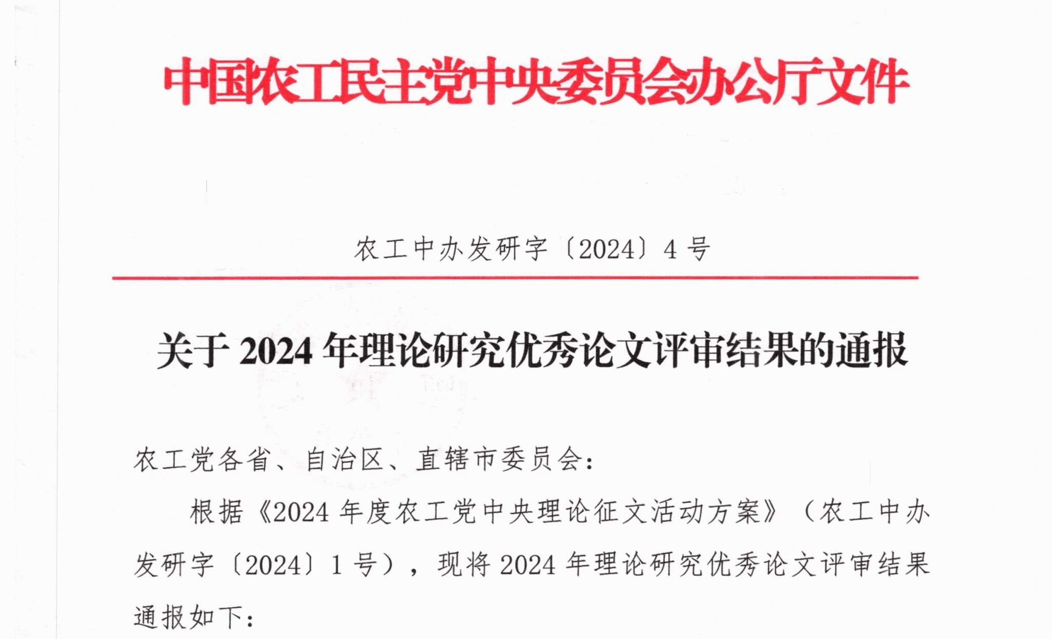 近日,中国农工民主党中央委员会办公厅发布了《关于2024年理论研究优秀论文评审结果的通报》,我校农工党党员王军民的《统一战线与新质生产力的内在机理研究》获二等奖,古小明的《中国新型政党制度建设研究》获三等奖。
